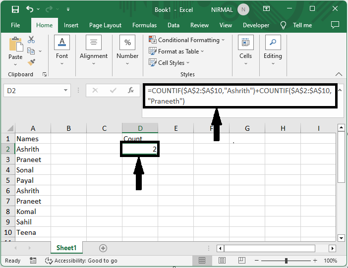 首先,要根據單個列中的文字值計算單元格,請單擊一個空單元格並輸入公式 =COUNTIF($A$2:$A$15,"KTE")+COUNTIF($A$2:$A$15,"KTO"),然後按 Enter 鍵。在公式 A2:A15 中,單元格的範圍
