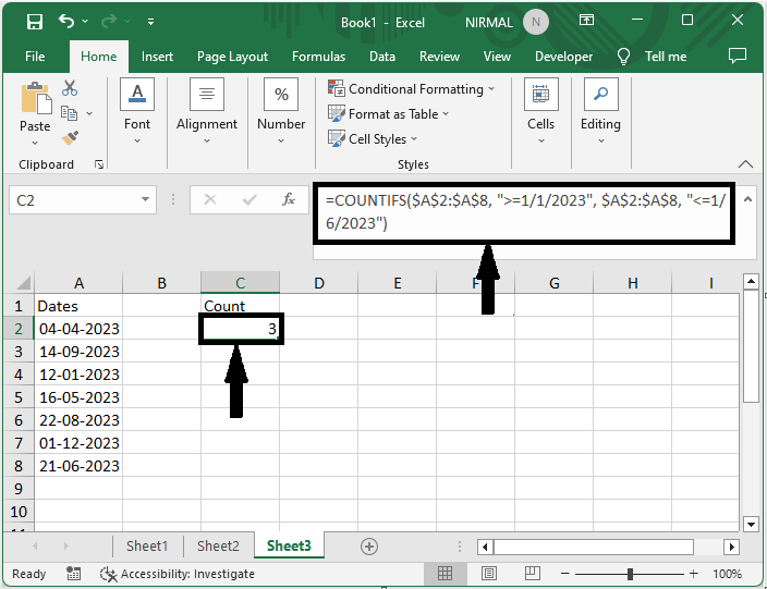 最後,要計算兩個日期之間的單元格,請單擊一個空單元格並輸入公式 =COUNTIFS($B$2:$B$15, ">=5/1/2019", $B$2:$B$15, "<=8/1/2019"),然後按 Enter 鍵。在公式 B2:B15 中,單元格的範圍