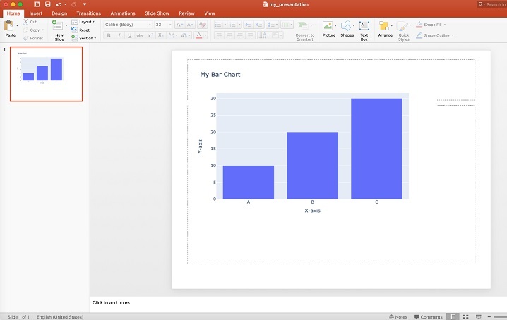 當我們在終端執行上述命令時,它將在與Python檔案相同的目錄中建立一個影像檔案my_bar_chart.png和一個PowerPoint簡報檔案my_presentation.pptx。您可以開啟PowerPoint簡報以檢視插入到幻燈片中的圖表。
