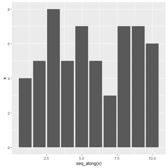 x<-rpois(10,5) library(reshape2) x_melted<-melt(x) library(ggplot2) ggplot(x_melted,aes(x=seq_along(x),y=x))+geom_bar(stat="identity")