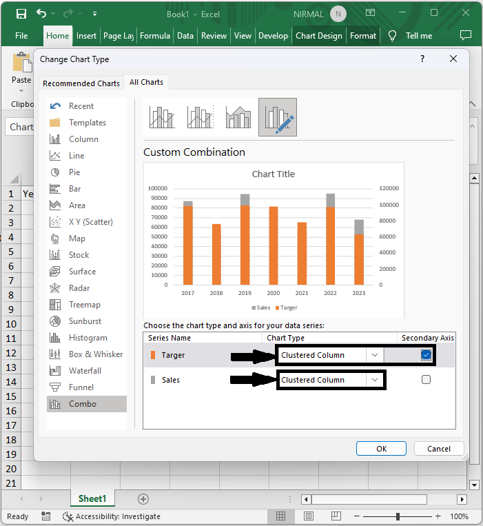 然後右鍵單擊圖表並選擇“更改圖表型別”。然後單擊“組合”,將兩個圖表都更改為“簇狀條形圖”,選中一個複選框,然後單擊“確定”。