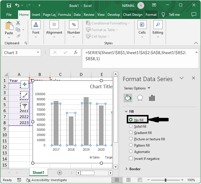 然後右鍵單擊底部系列並選擇“設定資料系列格式”。然後減小間隙寬度並將填充更改為“無填充”以完成任務。