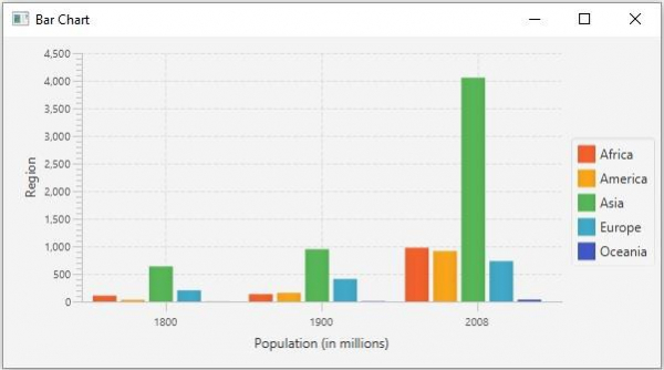 條形圖以一系列資料點 (x, y) 作為輸入值,並建立表示其值的條形。通常,這些圖表用於表示類別的值。根據類別的軸,條形圖的條形可以是垂直的或水平的。在 JavaFX 中,您可以透過例項化 **javafx.scene.chart.BarChart** 類來建立條形圖。