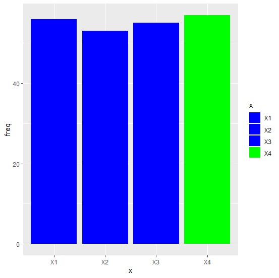library(ggplot2) ggplot(df,aes(x,freq,fill=x))+geom_bar(stat="identity")+ scale_fill_manual(values=c("blue","blue","blue","green"))輸出