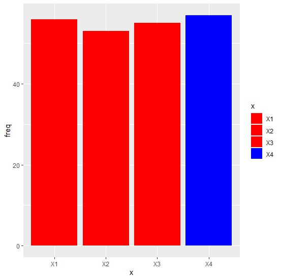 ggplot(df,aes(x,freq,fill=x))+geom_bar(stat="identity")+ scale_fill_manual(values=c("red","red","red","blue"))輸出