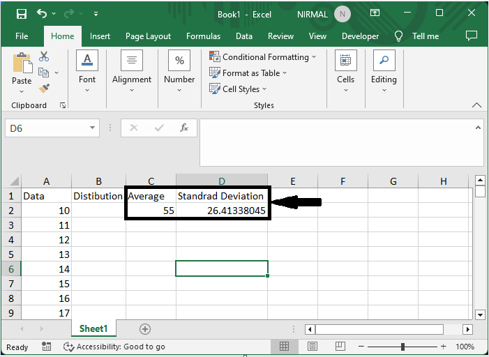 然後在單元格 C2 中,輸入公式 =AVERAGE(A2:A92),在單元格 D2 中,輸入公式 =STDEV(A2:A92),然後單擊回車。