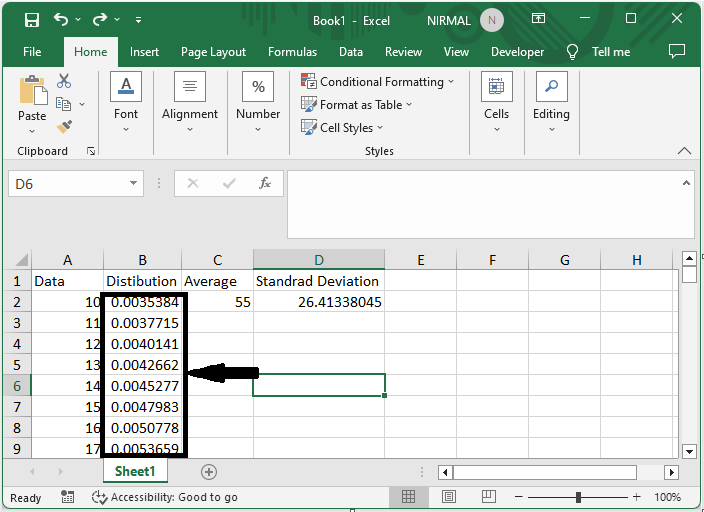 現在在單元格 B2 中,輸入公式 =NORM.DIST(A2,$C$2,$D$2,FALSE) 並單擊回車,然後使用自動填充柄向下拖動。