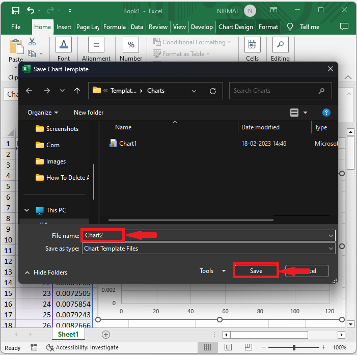 然後右鍵單擊圖表並選擇“另存為模板”。然後輸入名稱,將“儲存型別”設定為“Excel 模板”,然後單擊“確定”。