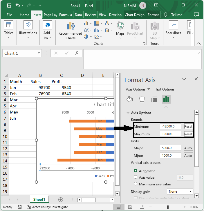 右鍵單擊 > 設定座標軸格式 > 最大值 > 最小值 > 選中複選框。