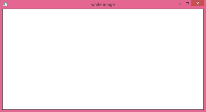 # import required libraries import cv2 import numpy as np # create a white image img = np.ones((350, 700, 3), dtype = np.uint8) img = 255* img # display the image using opencv cv2.imshow('white image', img) cv2.waitKey(0)