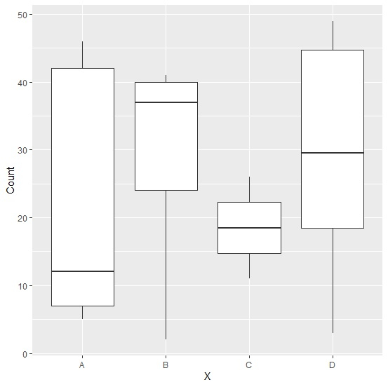 X<-sample(LETTERS[1:4],20,replace=TRUE) Count<-sample(1:50,20) df<-data.frame(X,Count) library(ggplot2) ggplot(data=df,aes_string(x="X",y="Count"))+geom_boxplot()