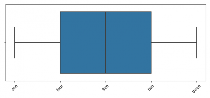 import seaborn as sns from matplotlib import pyplot as plt plt.rcParams["figure.figsize"] = [7.50, 3.50] plt.rcParams["figure.autolayout"] = True xticks = [1, 4, 5, 2, 3] ax = sns.boxplot(xticks) ax.set_xticks(xticks) ax.set_xticklabels(["one", "two", "three", "four", "five"], rotation=45) plt.show()