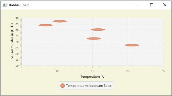 以下是 JavaFX 示例,演示如何建立具有兩個值的氣泡圖 −