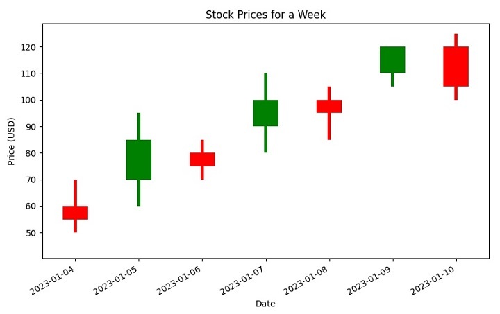 現在讓我們探討下面顯示的程式碼。此程式碼建立一個 K 線圖,以使用 Python 中的 matplotlib 庫表示一週內股票的開盤價、收盤價、最高價和最低價。
