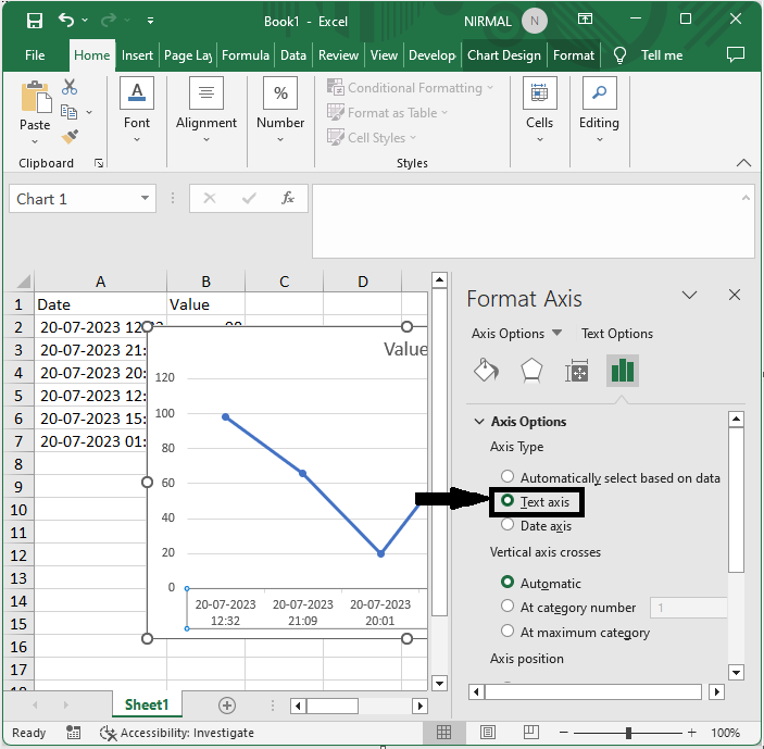 然後在“座標軸選項”下選擇“文字座標軸”以完成任務,然後關閉格式。