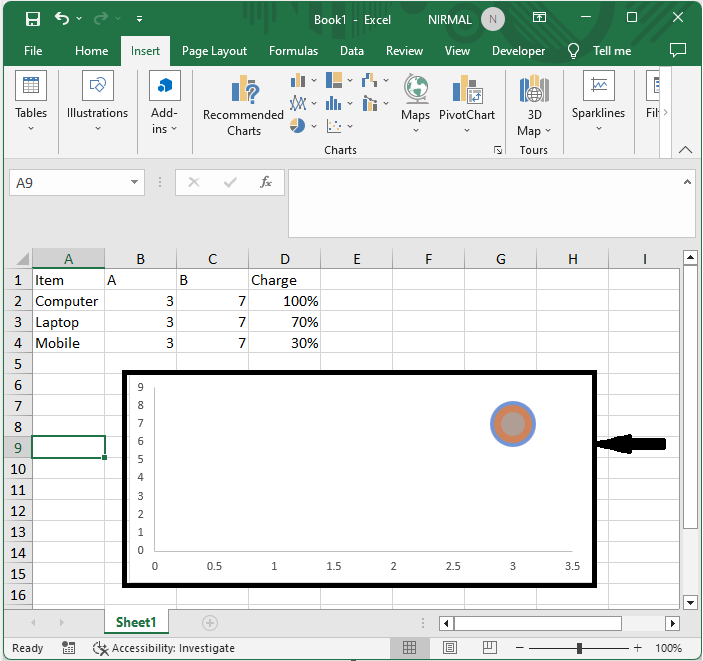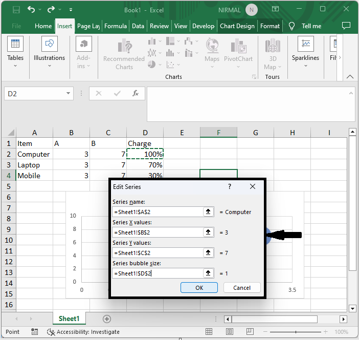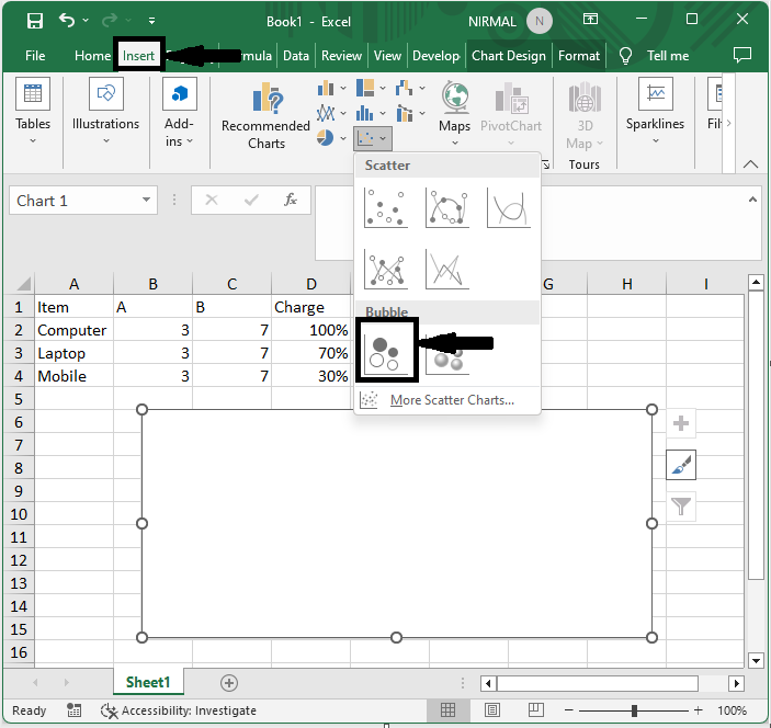 然後單擊“插入”,選擇氣泡圖,無需選擇任何資料。