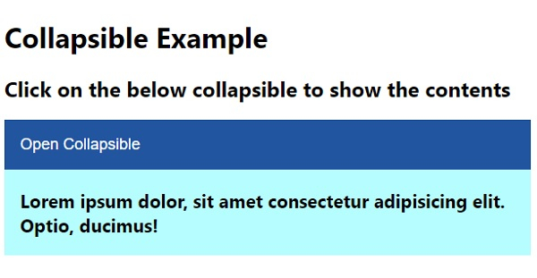 <!DOCTYPE html> <html> <head> <meta name="viewport" content="width=device-width, initial-scale=1" /> <style> body { font-family: "Segoe UI", Tahoma, Geneva, Verdana, sans-serif; } .collapse { background-color: rgb(83, 186, 255); color: white; cursor: pointer; padding: 18px; width: 100%; border: none; text-align: left; outline: none; font-size: 18px; } .active, .collapse:hover { background-color: rgb(34, 85, 160); } .content { padding: 0 18px; display: none; overflow: hidden; background-color: #b6fdff; font-size: 18px; } </style> </head> <body> <h1>Collapsible Example</h1> <h2>Click on the below collapsible to show the contents</h2> <button type="button" class="collapse">Open Collapsible</button> <div class="content"> <h3> Lorem ipsum dolor, sit amet consectetur adipisicing elit. Optio, ducimus! </h3> </div> <script> var collapse = document.querySelector(".collapse"); var i; collapse.addEventListener("click", function() { this.classList.toggle("active"); var content = this.nextElementSibling; if (content.style.display === "block") { content.style.display = "none"; } else { content.style.display = "block"; } }); </script> </body> </html>
