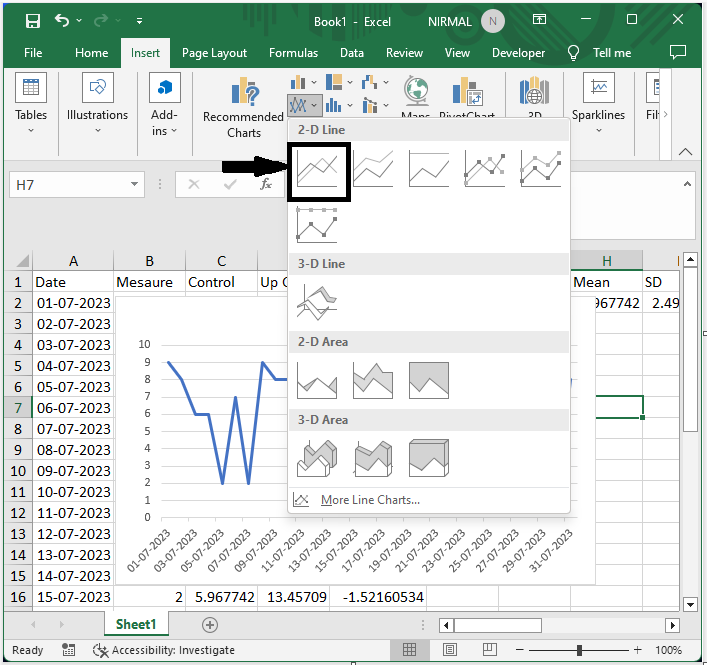 然後選擇單元格範圍,然後單擊“插入”,並選擇折線圖。