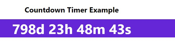<!DOCTYPE html> <html> <head> <meta name="viewport" content="width=device-width, initial-scale=1" /> <style> body { font-family: "Segoe UI", Tahoma, Geneva, Verdana, sans-serif; } .timer { text-align: center; font-size: 60px; margin-top: 0px; color: white; background-color: rgb(100, 38, 214); } </style> </head> <body> <h1 style="text-align: center;">Countdown Timer Example</h1> <h2 class="timer"></h2> <script> var countDownDate = new Date("June 5, 2022 11:27:15").getTime(); var timeClear = setInterval(function() { var now = new Date().getTime(); var timeLeft = countDownDate - now; var days = Math.floor(timeLeft / (1000 * 60 * 60 * 24)); var hours = Math.floor( (timeLeft % (1000 * 60 * 60 * 24)) / (1000 * 60 * 60) ); var minutes = Math.floor((timeLeft % (1000 * 60 * 60)) / (1000 * 60)); var seconds = Math.floor((timeLeft % (1000 * 60)) / 1000); document.querySelector(".timer").innerHTML = days + "d " + hours + "h " + minutes + "m " + seconds + "s "; if (timeLeft < 0) { clearInterval(timeClear); document.querySelector(".timer").innerHTML = "Timer Finished"; } }, 1000); </script> </body> </html>