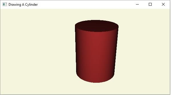 import javafx.application.Application; import javafx.scene.Group; import javafx.scene.PerspectiveCamera; import javafx.scene.Scene; import javafx.scene.paint.Color; import javafx.scene.paint.PhongMaterial; import javafx.stage.Stage; import javafx.scene.shape.CullFace; import javafx.scene.shape.Cylinder; import javafx.scene.shape.DrawMode; import javafx.scene.transform.Rotate; public class DrawingCylinder extends Application { public void start(Stage stage) { //Drawing a Cylinder Cylinder cylinder = new Cylinder(); //Setting the properties of the Box(cube) cylinder.setHeight(250.0); cylinder.setRadius(100.0); //Setting other properties cylinder.setCullFace(CullFace.BACK); cylinder.setDrawMode(DrawMode.FILL); PhongMaterial material = new PhongMaterial(); material.setDiffuseColor(Color.BROWN); cylinder.setMaterial(material); //Translating cylinder.setTranslateX(300.0); cylinder.setTranslateY(250.0); cylinder.setTranslateZ(150.0); //Setting the perspective camera PerspectiveCamera cam = new PerspectiveCamera(); cam.setTranslateX(-50); cam.setTranslateY(25); cam.setTranslateZ(0); cam.setRotationAxis(Rotate.X_AXIS); cam.setRotate(-25); //Setting the Scene Group root = new Group(cylinder); Scene scene = new Scene(root, 595, 300, Color.BEIGE); scene.setCamera(cam); stage.setTitle("Drawing A Cylinder"); stage.setScene(scene); stage.show(); } public static void main(String args[]){ launch(args); } }
