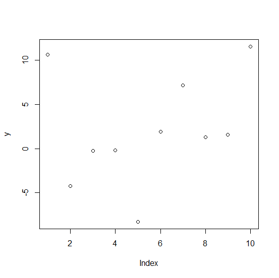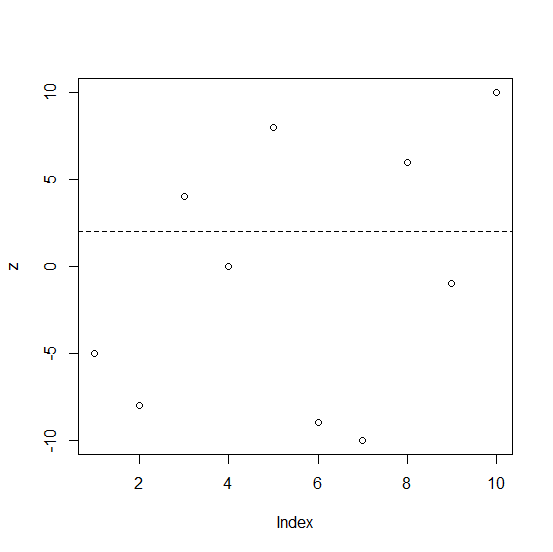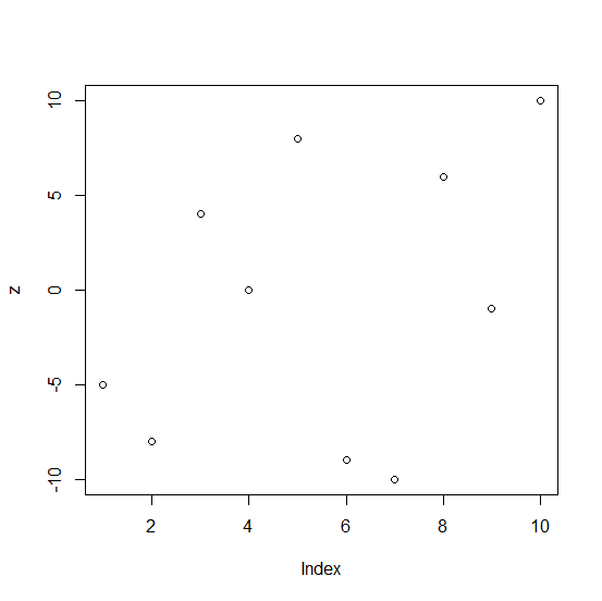 z<−sample(c(-10:10),10) z [1] −5 −8 4 0 8 −9 −10 6 −1 10 plot(z)