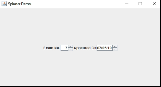 package my; import java.awt.GridBagLayout; import java.util.Calendar; import java.util.Date; import javax.swing.*; public class SwingDemo { public static void main(String[] args) { JFrame frame = new JFrame("Spinner Demo"); JPanel panel = new JPanel(); JLabel label = new JLabel("Exam No."); JLabel label2 = new JLabel(" Appeared On"); panel.setLayout(new GridBagLayout()); int min = 0; int max = 10; int step = 1; int i = 5; SpinnerModel value = new SpinnerNumberModel(i, min, max, step); JSpinner spinner = new JSpinner(value); spinner.setBounds(50, 80, 70, 100); Date today = new Date(); JSpinner spinner2 = new JSpinner(new SpinnerDateModel(today, null, null, Calendar.MONTH)); JSpinner.DateEditor editor = new JSpinner.DateEditor(spinner2, "dd/MM/yy"); spinner2.setEditor(editor); panel.add(label); panel.add(spinner); panel.add(label2); panel.add(spinner2); frame.add(panel); frame.setSize(550,300); frame.setVisible(true); } }