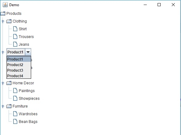 JComboBox comboBox = new JComboBox(new String[]{"Product1","Product2","Product3","Product4"});將編輯器的 JComboBox 設定為讓編輯器使用組合框 −