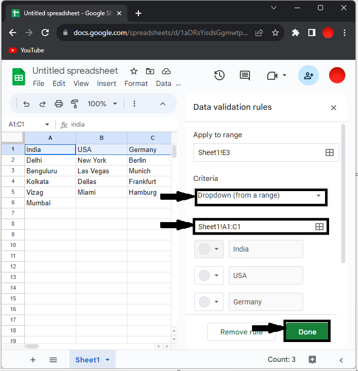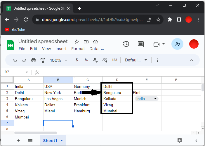 在這裡,我們將首先建立一個下拉列表來使用公式獲取資料,然後建立另一個列表來完成任務。讓我們來看一個簡單的過程,學習如何在 Google Sheets 中建立依賴型下拉列表。