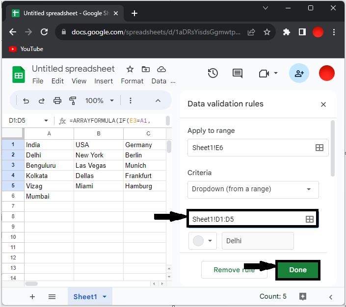 然後再次點選資料並選擇資料驗證,然後將條件輸入為 D1:D5 並點選完成以完成任務。