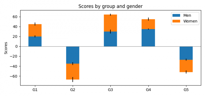 import matplotlib.pyplot as plt import numpy as np plt.rcParams["figure.figsize"] = [7.50, 3.50] plt.rcParams["figure.autolayout"] = True N = 5 menMeans = (20, -35, 30, 35, -27) womenMeans = (25, -32, 34, 20, -25) menStd = (2, 3, 4, 1, 2) womenStd = (3, 5, 2, 3, 3) ind = np.arange(N) width = 0.35 fig, ax = plt.subplots() p1 = ax.bar(ind, menMeans, width, yerr=menStd, label='Men') p2 = ax.bar(ind, womenMeans, width, bottom=menMeans, yerr=womenStd, label='Women') ax.axhline(0, color='grey', linewidth=0.8) ax.set_ylabel('Scores') ax.set_title('Scores by group and gender') ax.set_xticks(ind) ax.set_xticklabels(('G1', 'G2', 'G3', 'G4', 'G5')) ax.legend() plt.show()