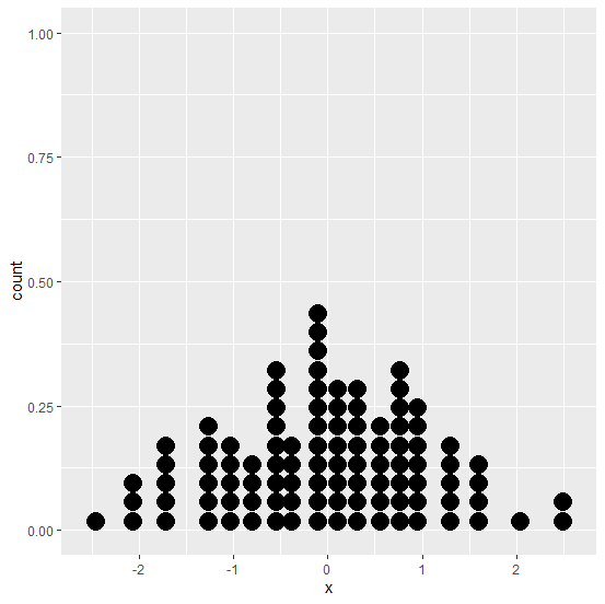 > y<-sample(1:10,100,replace=TRUE) > df2<-data.frame(y) > ggplot(df2,aes(y))+geom_dotplot(binwidth=0.2)