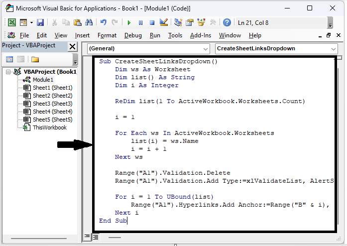 在這裡,我們將首先建立一個VBA模組,然後執行它來完成任務。讓我們來看一個簡單的過程,瞭解如何在Excel中建立帶有每個工作表超連結的下拉列表。