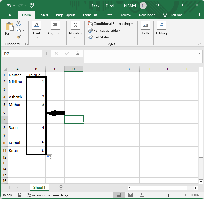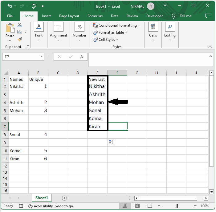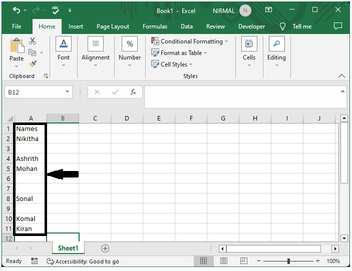 考慮一個 Excel 表格,其中包含一個帶有空單元格的名稱列表,類似於下圖。