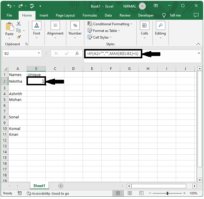 =IF(A2="","",MAX(B$1:B1)+1) 並單擊 Enter 以獲取第一個值。
