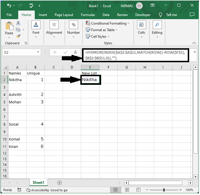 現在再次單擊一個空單元格,在本例中為單元格 E2,然後輸入公式:=IFERROR(INDEX($A$2:$A$11,MATCH(ROW()-ROW($F$1),$B$2:$B$11,0)),"") 並單擊 Enter。
