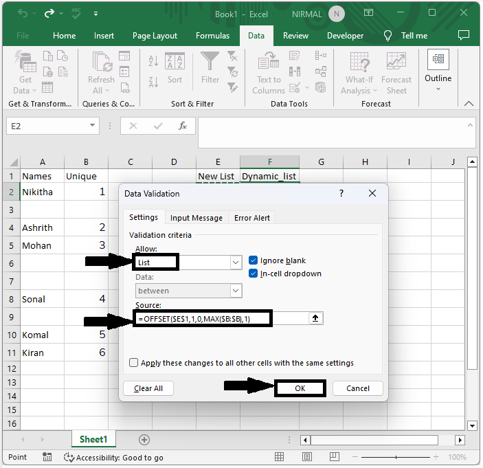 最後,單擊一個空單元格,然後單擊“資料”並選擇“資料驗證”以開啟彈出視窗。然後將“允許”列表和範圍更改為 =OFFSET($E$1,1,0,MAX($B:$B),1),然後單擊以完成任務。