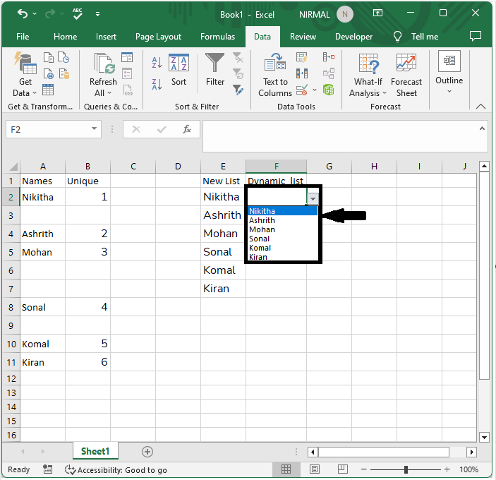 這裡我們將首先計算唯一記錄並列出它們,然後最終使用資料驗證建立列表。讓我們來看一個簡單的過程,瞭解如何在 Excel 中建立不留任何空單元格的動態列表。