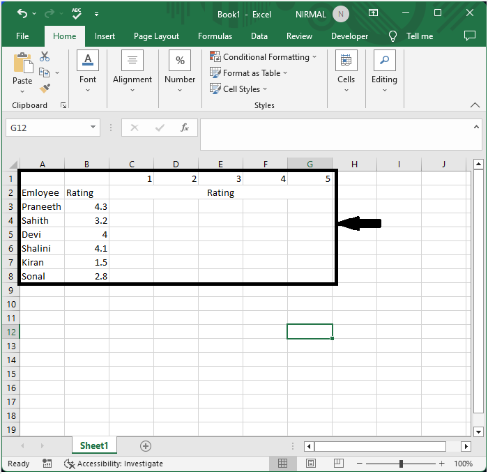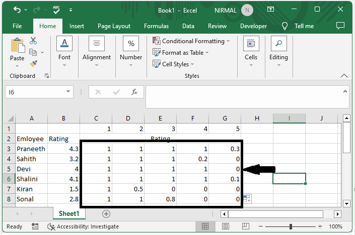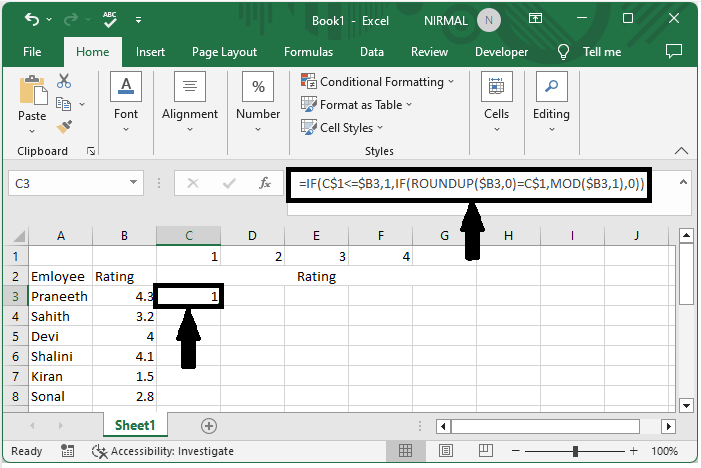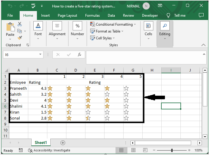 在這裡,我們將首先使用公式來拆分評分,然後使用條件格式來完成任務。讓我們來看一個簡單的過程,瞭解如何在Excel中建立五星級評分系統。