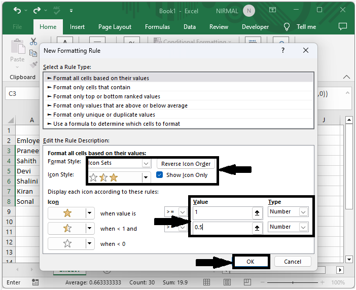 然後選擇單元格範圍,單擊“條件格式”,然後選擇“新建規則”。在彈出視窗中,將格式樣式更改為“圖示集”,圖示樣式更改為“星形”,然後更改值並單擊“確定”以完成任務。