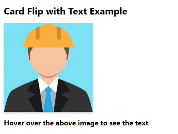 <!DOCTYPE html> <html> <head> <meta name="viewport" content="width=device-width, initial-scale=1"> <style> body { font-family: 'Segoe UI', Tahoma, Geneva, Verdana, sans-serif; margin:20px; } .flipCard { background-color: transparent; width: 300px; height: 300px; perspective: 1000px; } .innerCard { position: relative; width: 100%; height: 100%; text-align: center; transition: transform 0.6s; transform-style: preserve-3d; box-shadow: 0 4px 8px 0 rgba(0,0,0,0.2); } .flipCard:hover .innerCard { transform: rotateY(180deg); } .frontCard, .cardBack { position: absolute; width: 100%; height: 100%; -webkit-backface-visibility: hidden; backface-visibility: hidden; } .frontCard { background-color: rgb(124, 225, 243); color: black; } .cardBack { background-color: #3329b9; color: white; transform: rotateY(180deg); font-size: 18px; font-weight: bold; } </style> </head> <body> <h1>Card Flip with Text Example</h1> <div class="flipCard"> <div class="innerCard"> <div class="frontCard"> <img src="https://cdn.pixabay.com/photo/2016/04/01/11/25/avatar-1300331_960_720.png" alt="Avatar" style="width:300px;height:300px;"> </div> <div class="cardBack"> <h1>James Anderson</h1> <p>Architect</p> <p>Experience: 16 years</p> </div> </div> </div> <h2>Hover over the above image to see the text</h2> </body> </html>