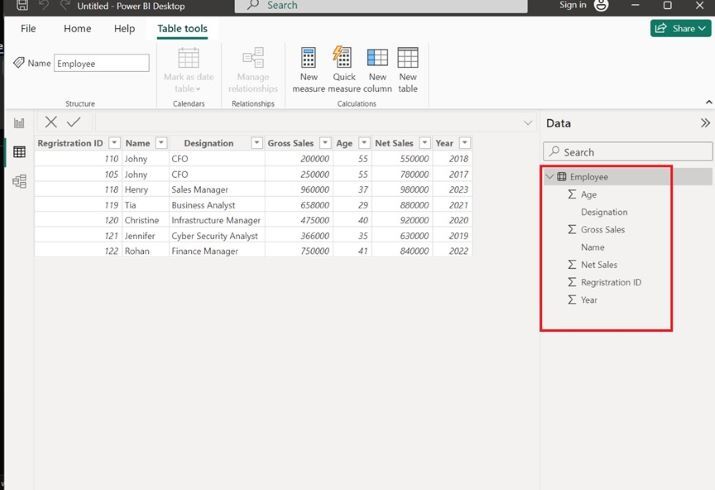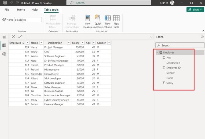 開啟 Power BI 桌面,並考慮包含以下六列的示例資料集“員工”−
