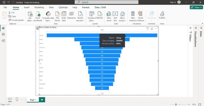 漏斗圖用於顯示資料在從一個階段過渡到下一階段時如何逐漸減少。最終階段表示最高值,而初始階段表示最小值。每個階段的資料都顯示為 100%(總計)的不同百分比。與聚類柱形圖不同,漏斗圖中不使用軸。例如,可以透過漏斗圖視覺化每月銷售額產量、識別員工的薪資範圍(從最高到最低)以及按月計算的淨收入。
