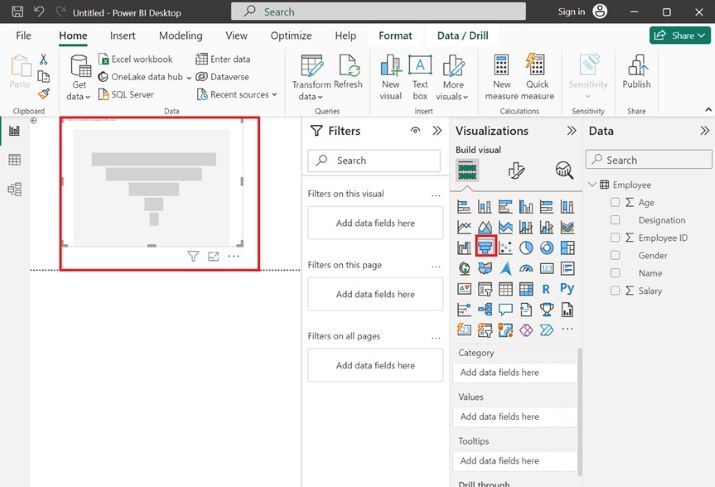 切換到報表檢視,並在“視覺化效果”窗格中選擇“漏斗圖”。預設漏斗圖不包含任何資料,如下所示−