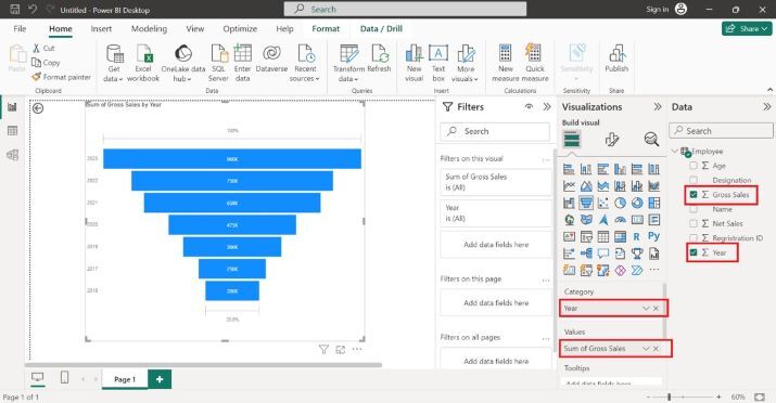 讓我們在漏斗圖中新增欄位值。將“年份”列新增到類別,選擇“總銷售額”列,並將其新增到值,如下所示。每個階段表示按年份計算的總百分比。
