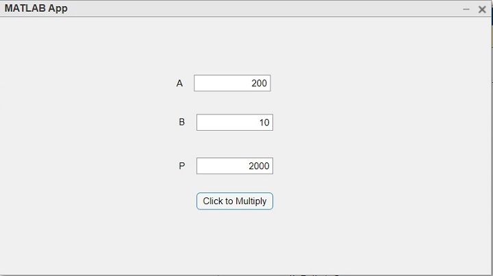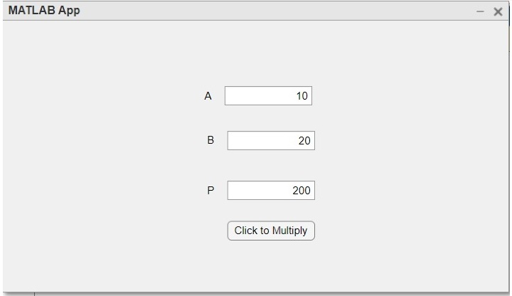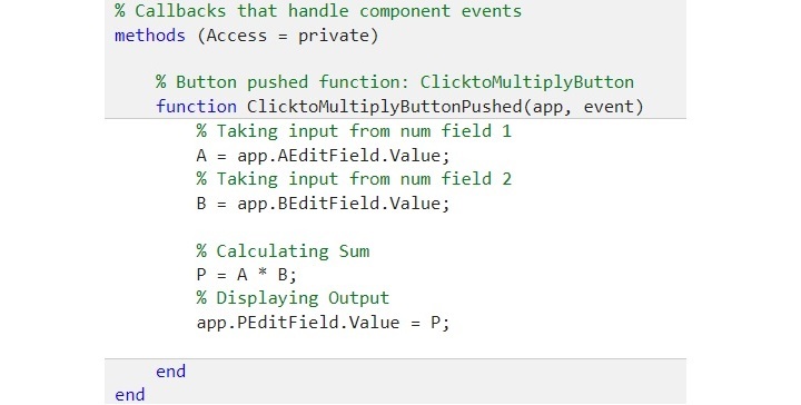 % Callbacks that handle component events methods (Access = private) % Button pushed function: ClicktoMultiplyButton function ClicktoMultiplyButtonPushed(app, event) % Taking input from num field 1 A = app.AEditField.Value; % Taking input from num field 2 B = app.BEditField.Value; % Calculating Sum P = A * B; % Displaying Output app.PEditField.Value = P; end end