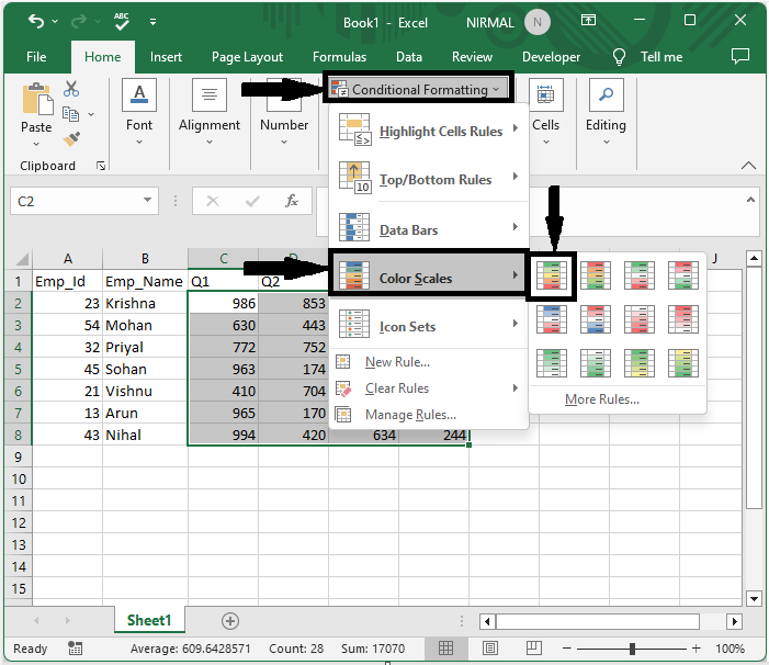 現在選擇單元格範圍,然後單擊條件格式並選擇顏色刻度,然後選擇其中一種型別即可完成任務。