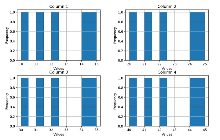此 Python 程式碼讀取 CSV 檔案並使用 Pandas 和 Matplotlib 繪製檔案中所有列的直方圖。然後,它在螢幕上顯示它們之前設定每個直方圖的標題和軸標籤。