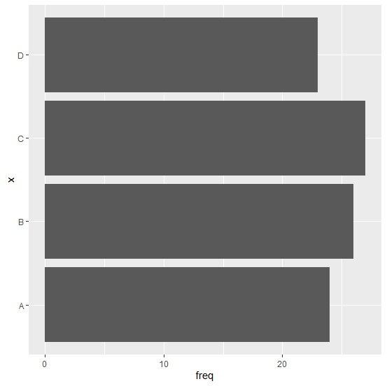 x<-c("A","B","C","D") freq<-c(24,26,27,23) df<-data.frame(x,freq) df