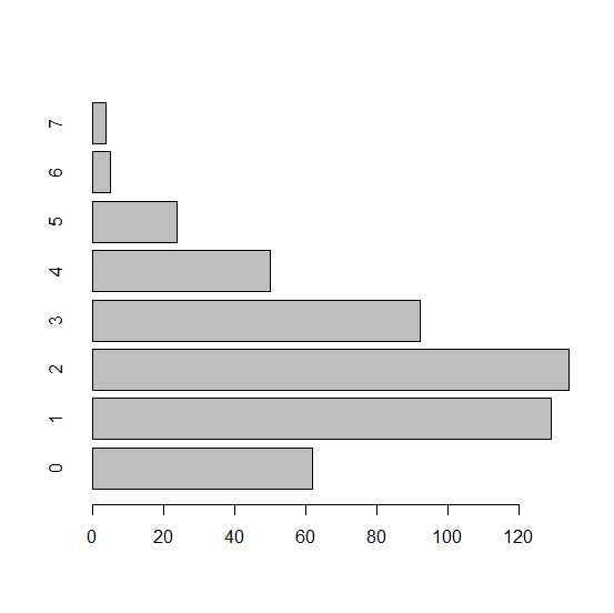 > y<-rpois(500,2) > barplot(table(y),horiz=TRUE)