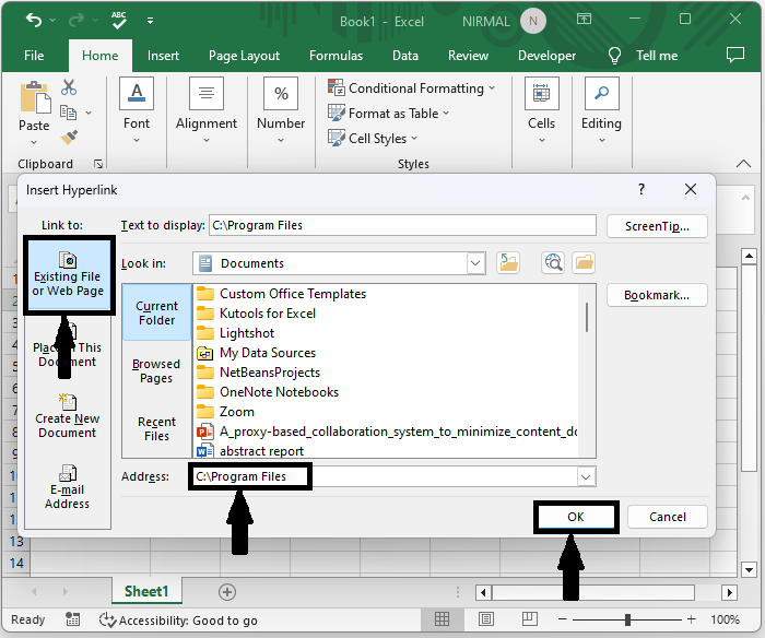 在彈出視窗中,單擊“現有檔案或網頁”,然後在“地址”中指定路徑,然後單擊“確定”以完成任務。